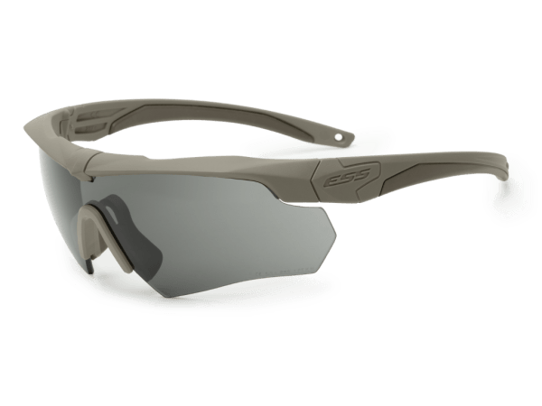 One Terrain Tan Crossbow frame w/interchangeable Smoke Gray lens, microfiber cleaning pouch & elastic retention strap.